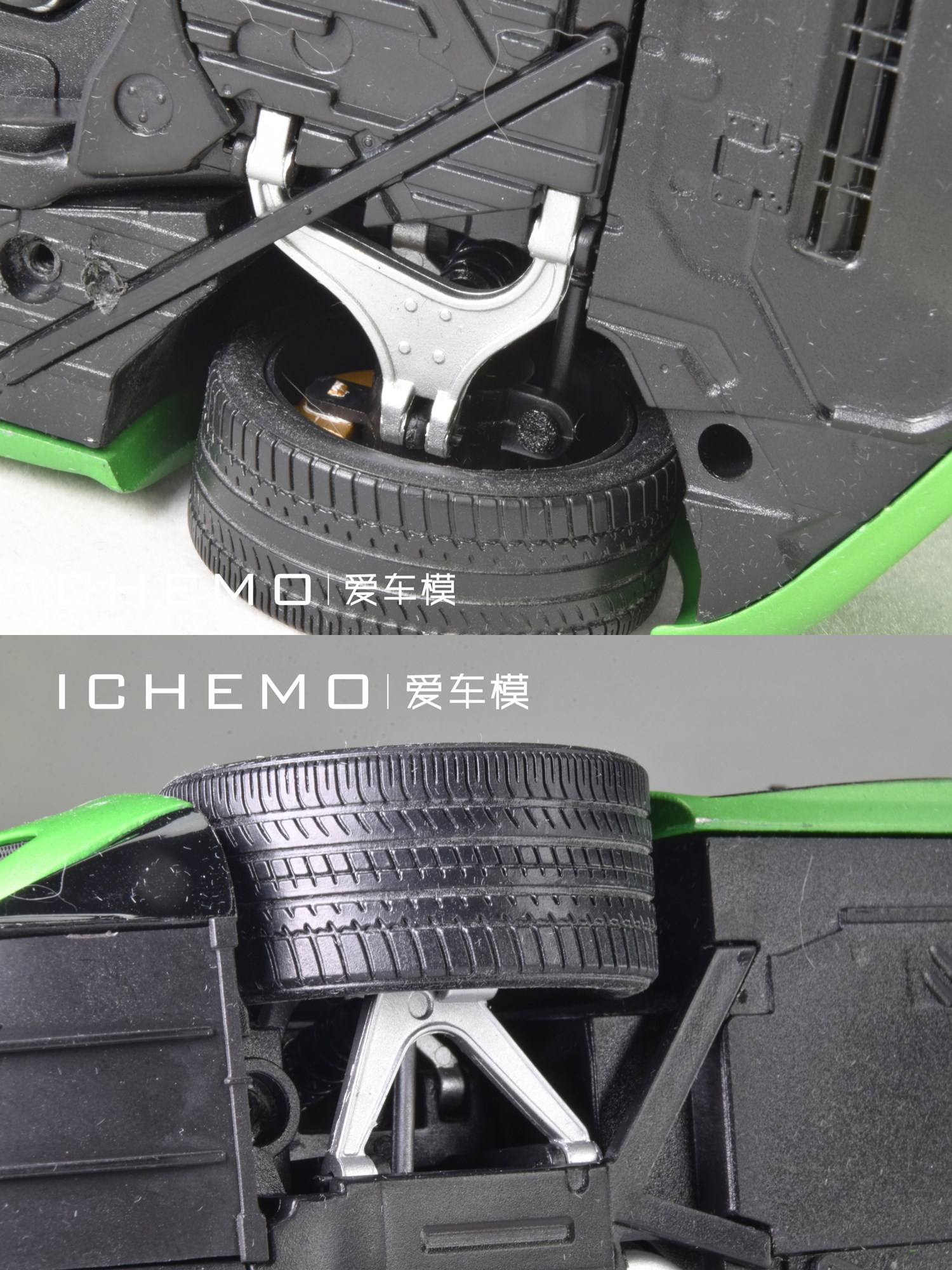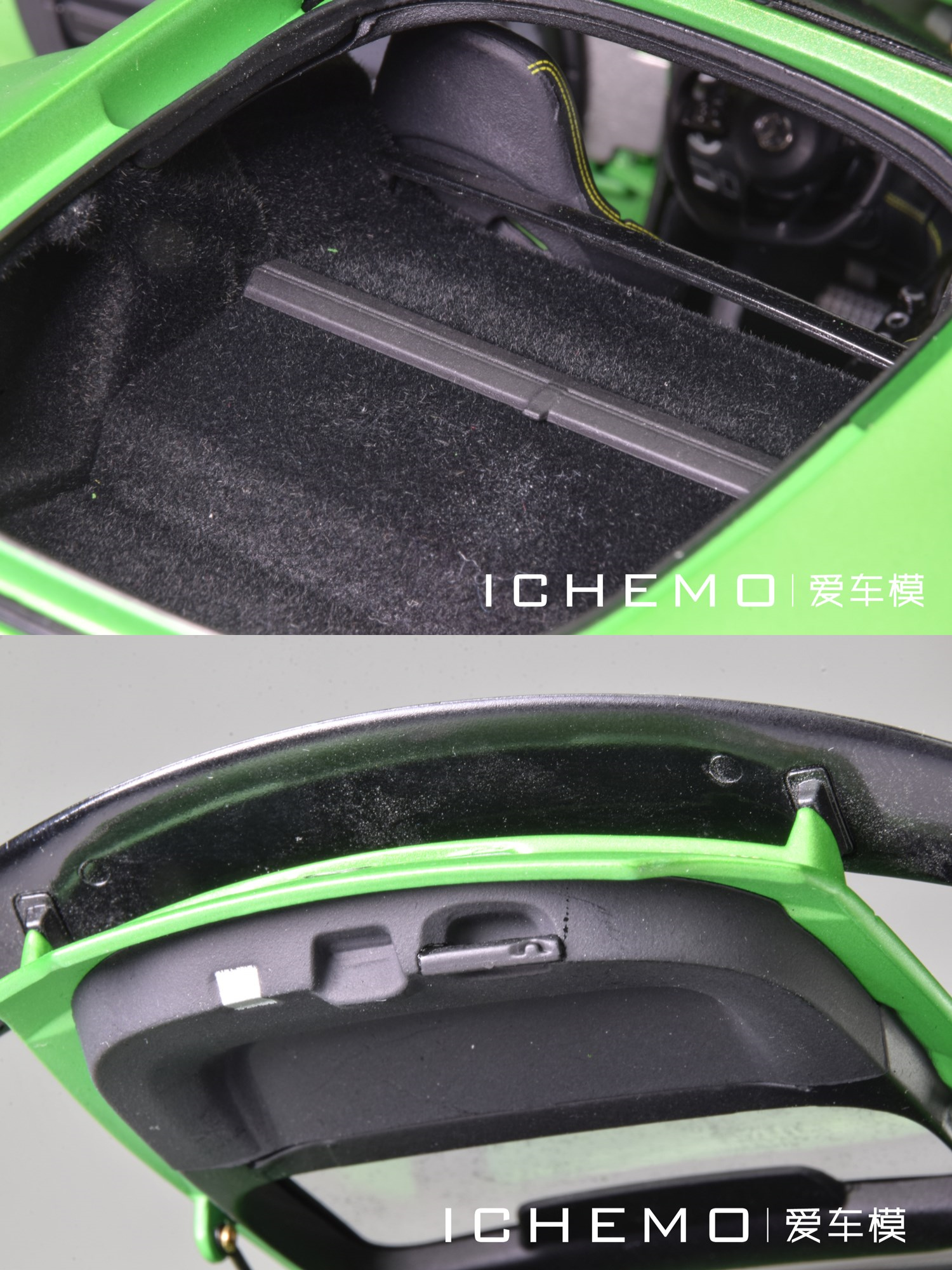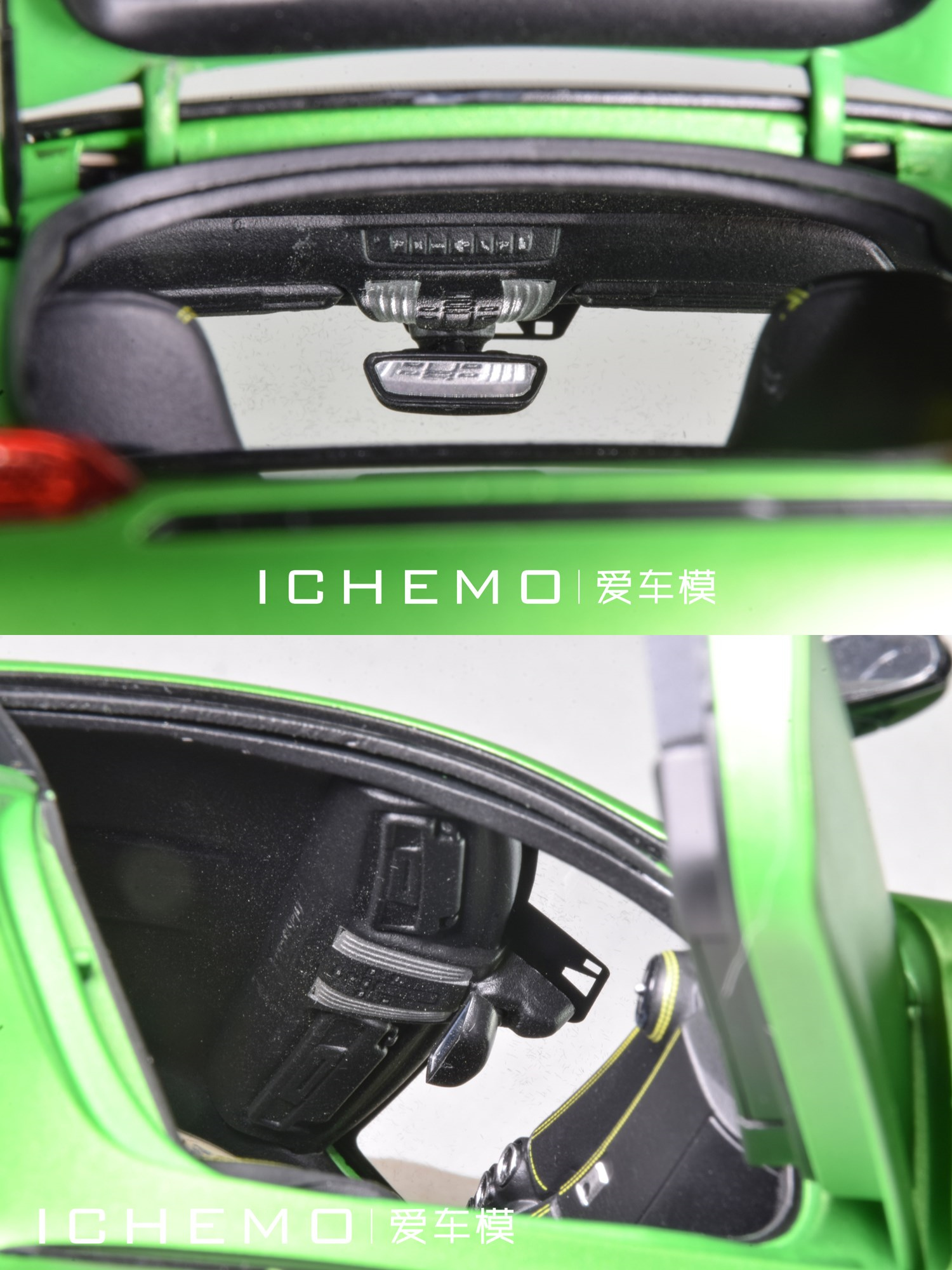模型为合金四开工艺(主体为锌合金材质):两侧车门、发动机盖和后备箱盖零件可以打开;两款配色均为金属漆面,但魔焰绿因漆面特殊性采用了更为繁琐的人工打磨和喷涂工艺。哪个配色更得你心呢?