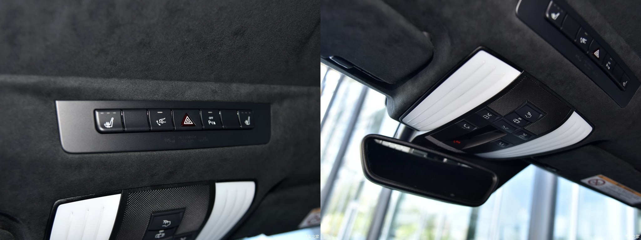 实车顶棚阅读灯位置集成了电加热座椅开关、双闪警示灯、驻车雷达等功能按钮。此部分在模型的相应位置上也有细节表达。下图为实车参考图片。