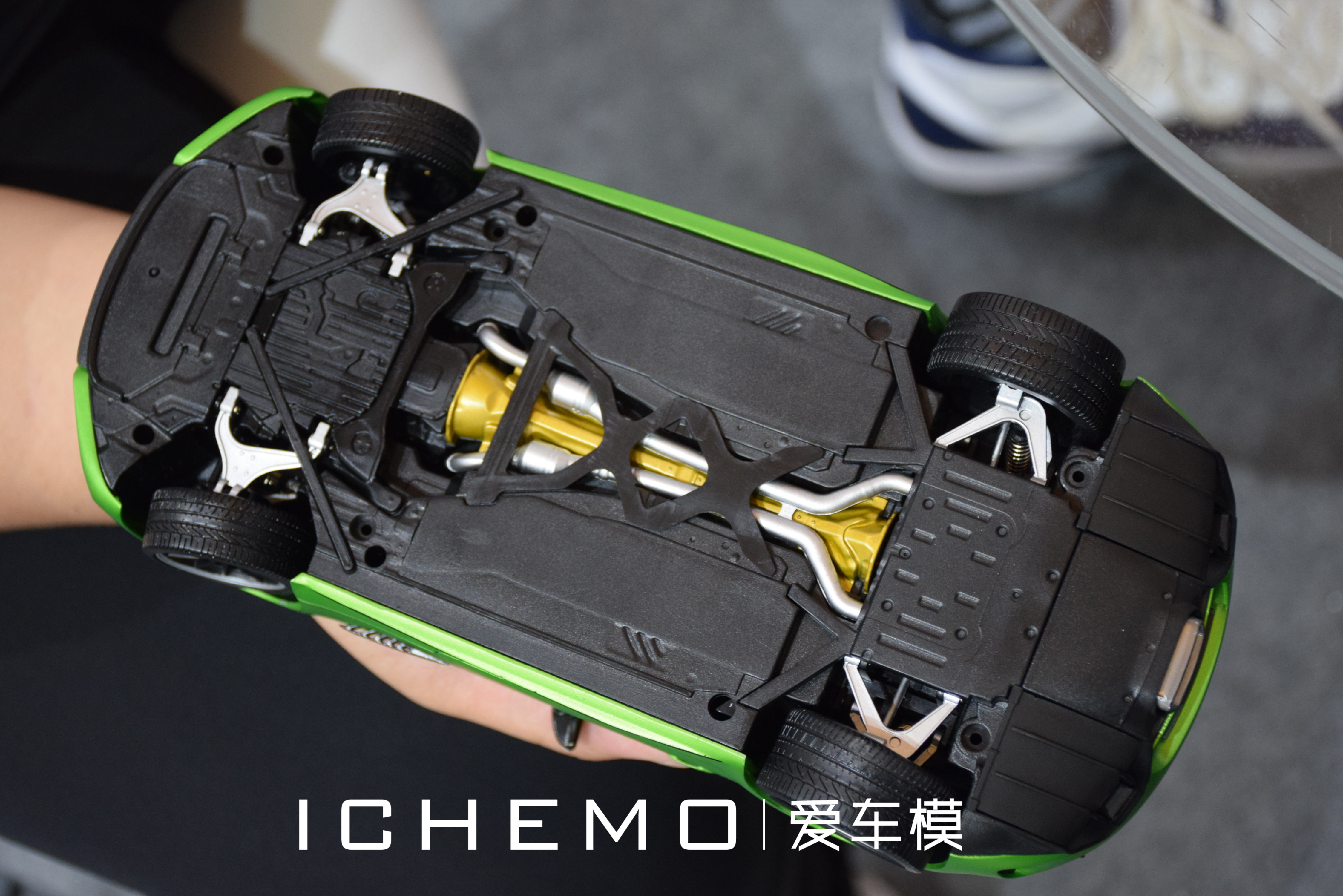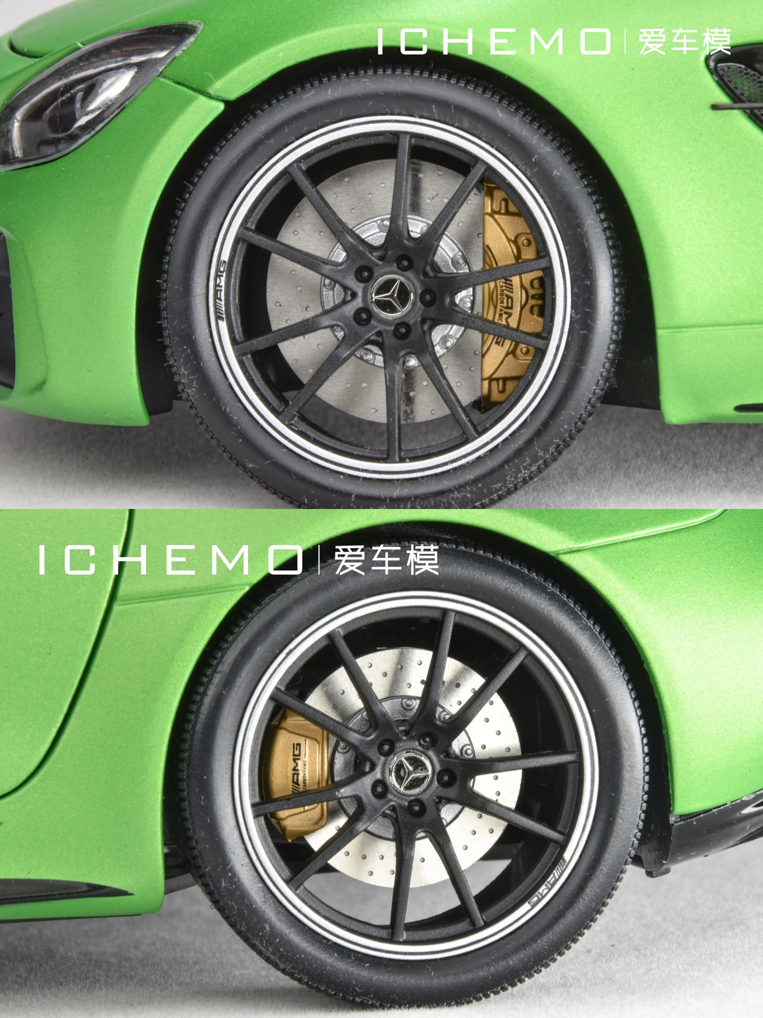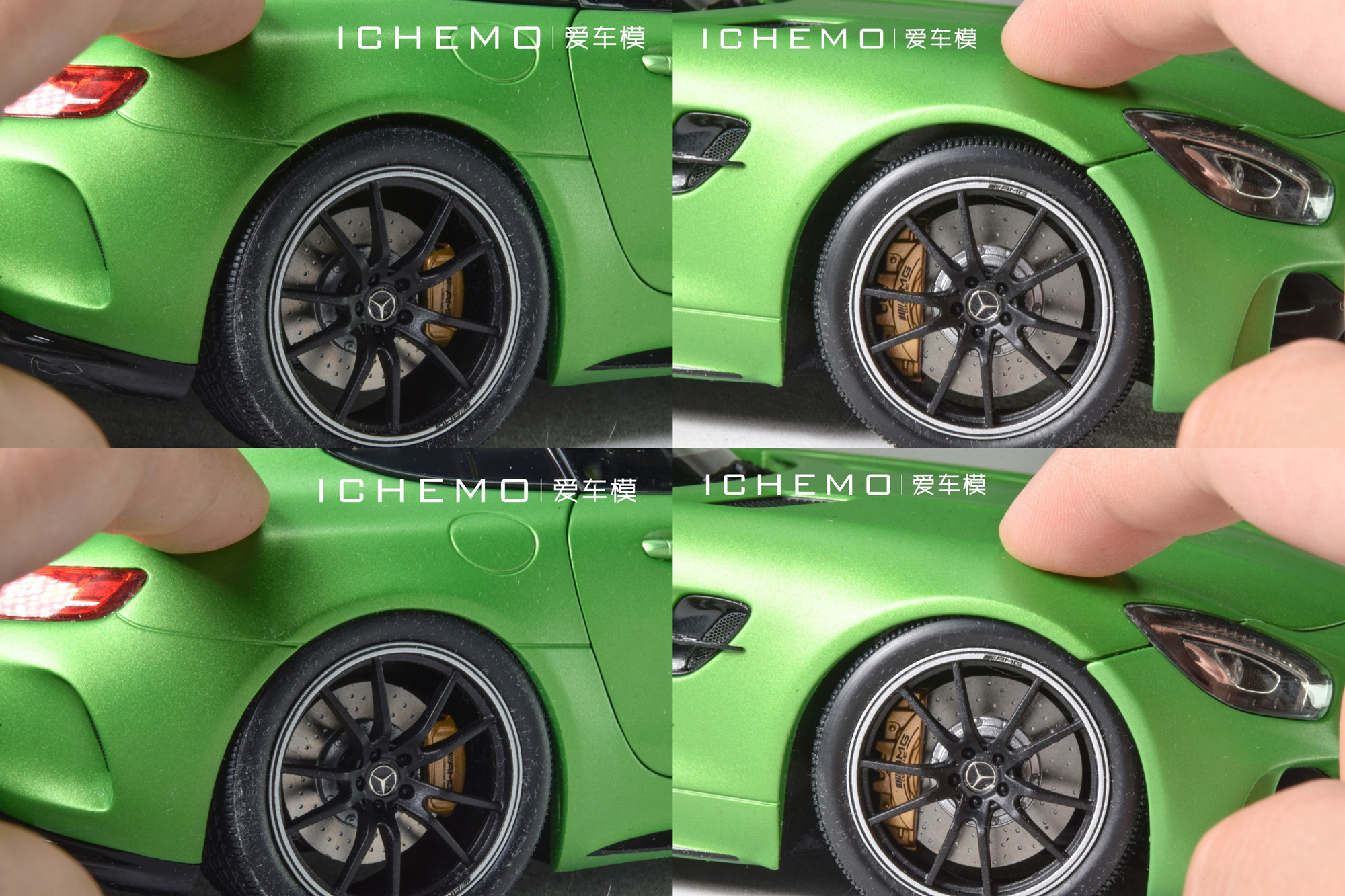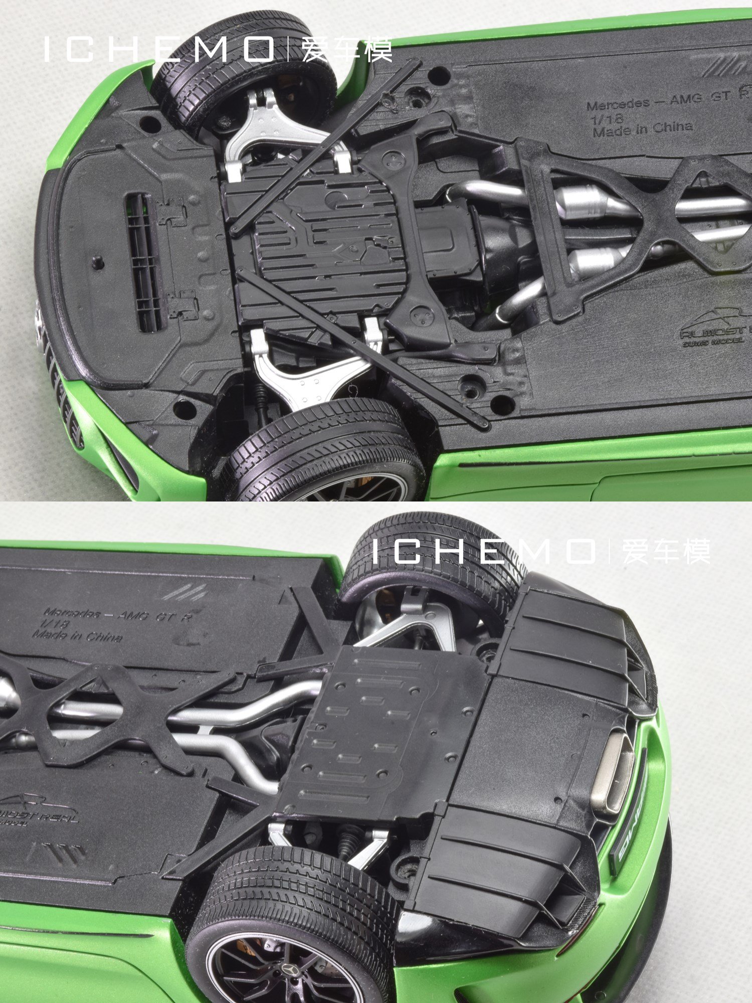 模型底盘主体为塑料材质,中部有“Mercedes-AMG GT R”车型标识以及模型比例、模型制造地和模型品牌信息。值得一提的是,量产成品模型底盘部分细节的分色处理与之前模型展上看到的样品略有不同。(下图为爱车模网 2018 中国国际模型博览会样品实拍)