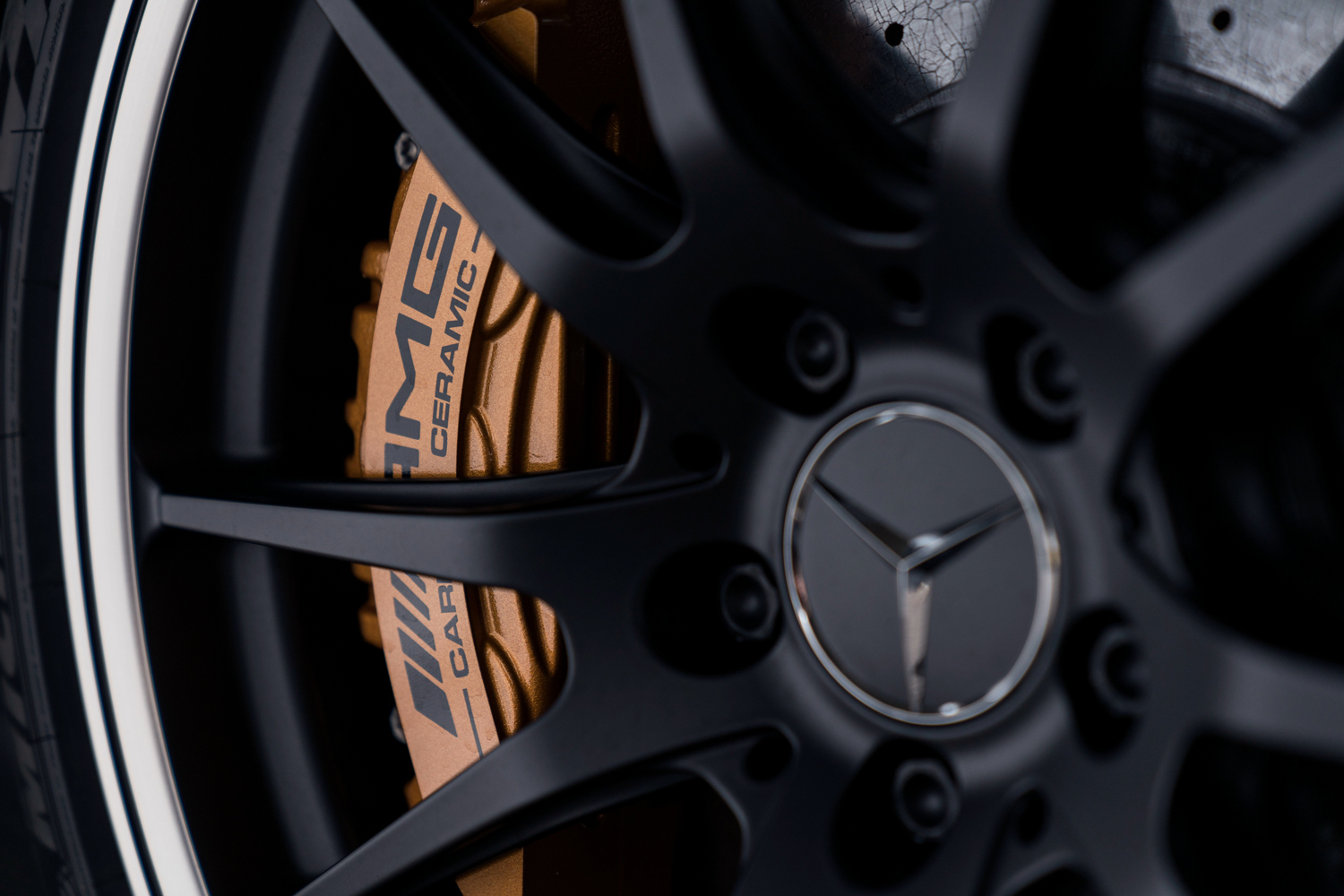 实车前轮尺寸参数为 275/35 ZR19,后轮为 325/30 ZR20,模型还原了较宽的后轮质感,胎壁上没有轮胎厂牌标识;轮毂式样为实车的 AMG 高性能双 5 辐锻造车轮。(下图为实车参考图)