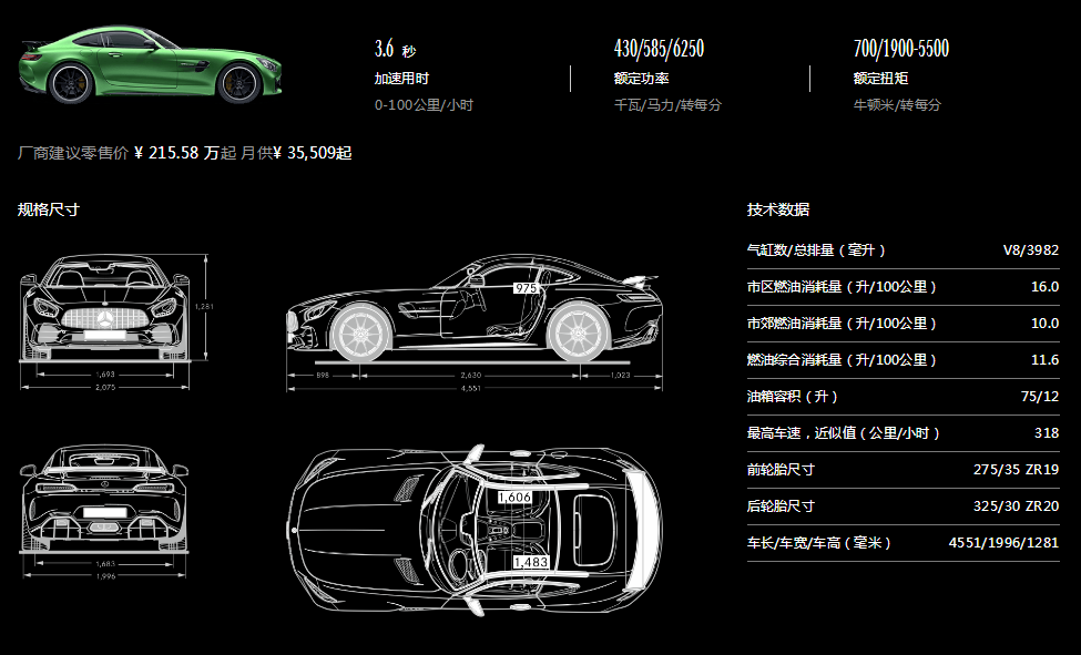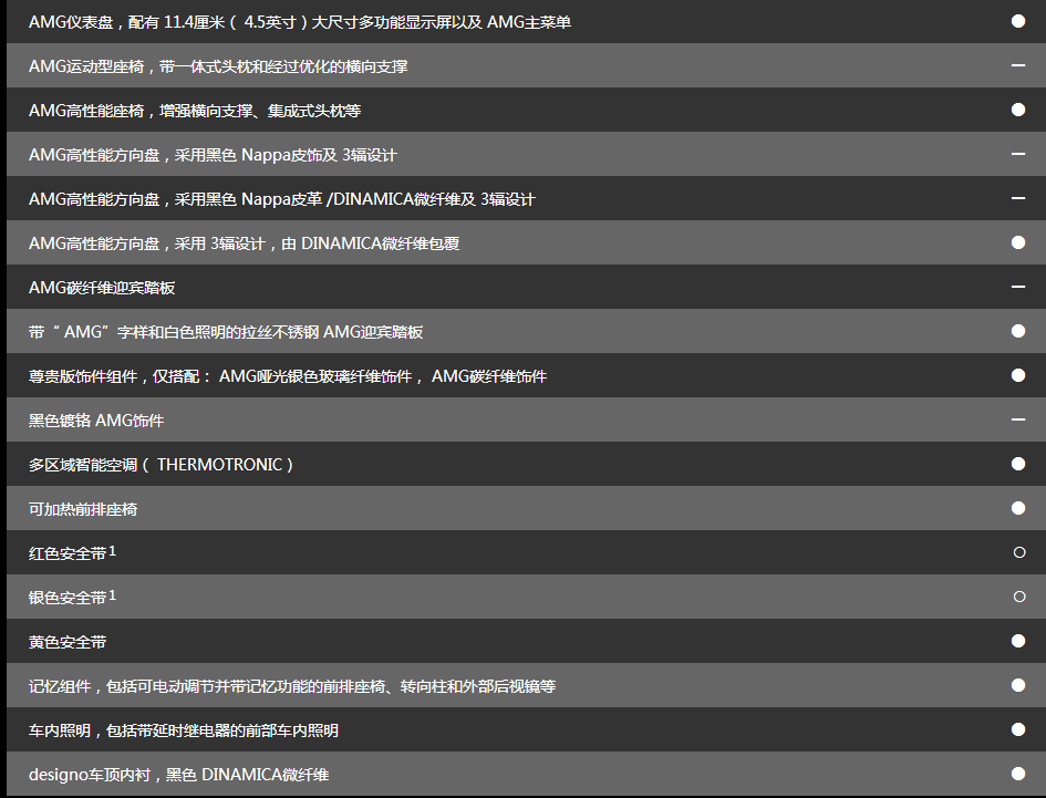 上图截自梅赛德斯(中国)官网,展示了 AMG GT R 内装部分的配置单。其中实心圆为标配,空心圆为选配,横杠为未配备。仅以此为模型式样之参考。