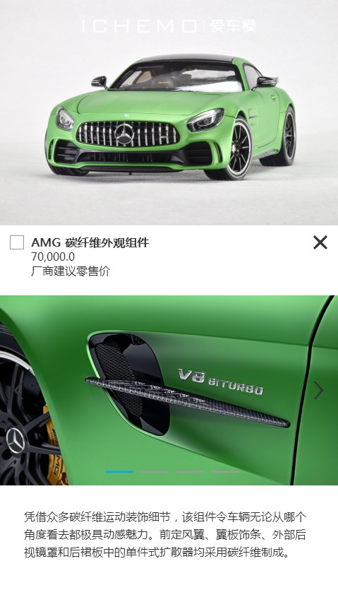 AMG 碳纤维外观组件(包括前裙板前定风翼、外部后视镜罩、翼板饰条、 碳纤维后裙板扩散器)是需要选装的配件,在模型上均有所体现。顺便一提,这套零碎(国内)厂商建议售价为 70000 元人民币 ...