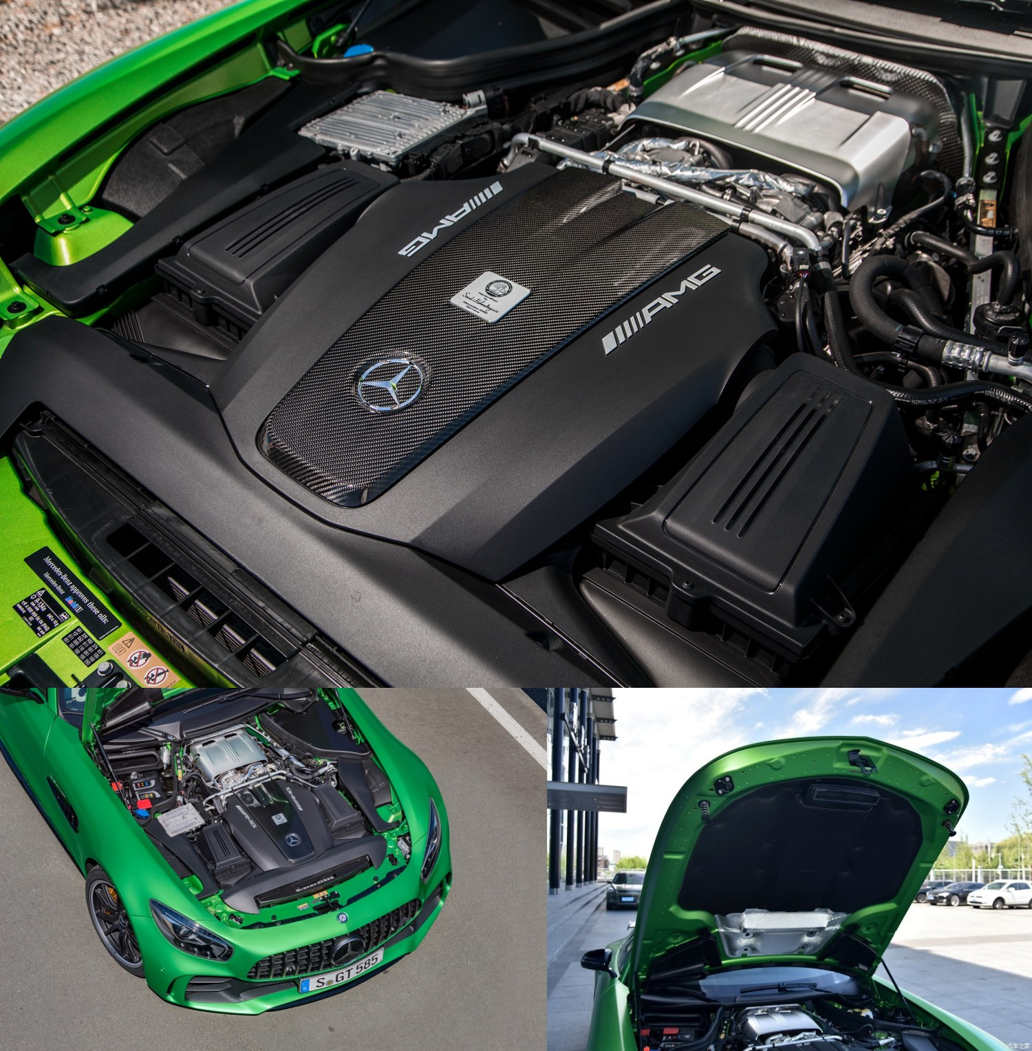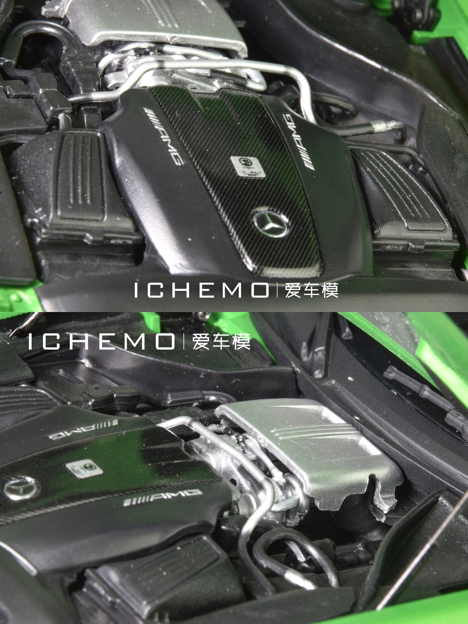 实际上 AMG GT R 的发动机主体并不在发动机罩下,而是位于后部(银色部分);模型发动机舱靠近防火墙的两侧通风口为封闭式样。值得一提的是,模型的发动机部分为独立结构,从模型底盘处能看到部分发动机/变速箱细节,但具体的独立度还有待拆车见分晓。