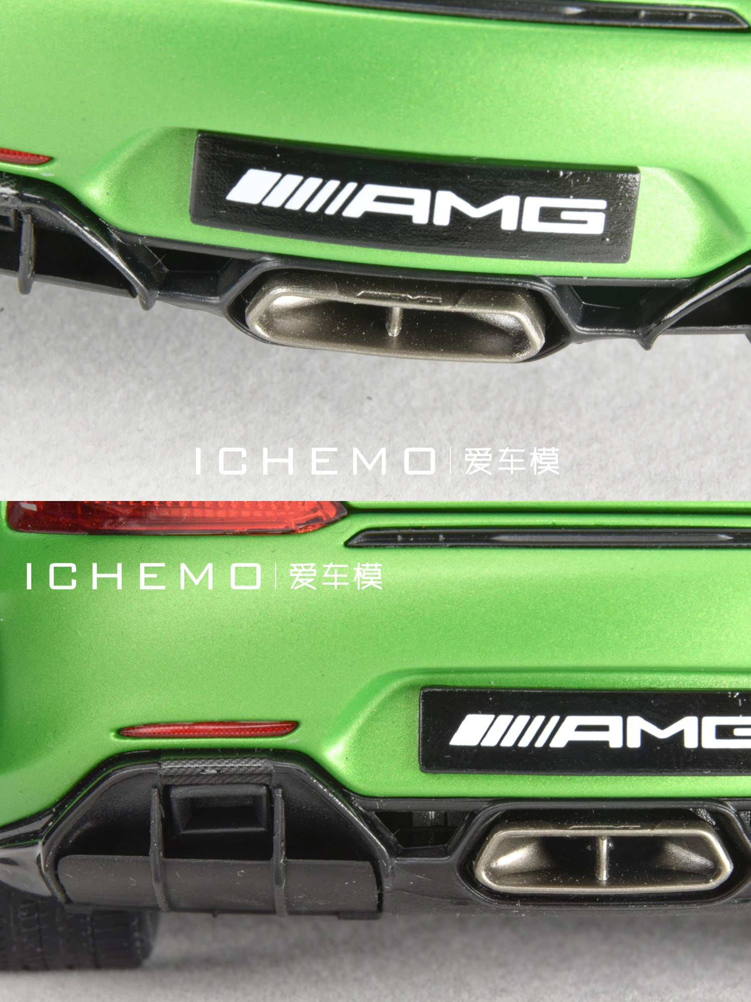 车尾中置双出排气上可见 AMG 字符细节;两侧的方形排气细节有所体现;模型整个尾部式样为实车的(选装)AMG 碳纤维外观组件 II。值得一提的是 AMG GT R 实车的驻车雷达为标配,但模型的车屁股无比光滑,疑似细节事实缺失。