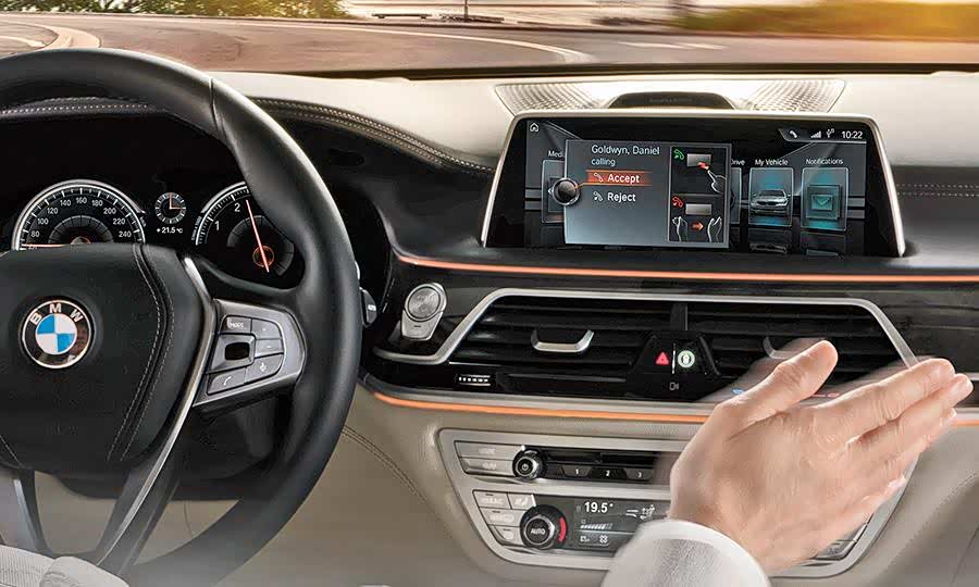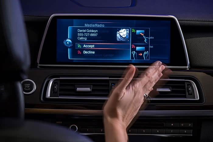 宝马家族的 7 系、5 系以及 X7、X5、X3 现在带有手势识别功能,其中 7 系是全球第一个装载手势识别的量产车型。它的手势识别区域为车机屏前方,供应商为德尔福,采用的是 TOF 方案,可以识别 7 种预设手势,包括接挂电话、选择歌曲、调节音量、控制导航等功能。