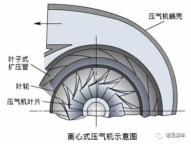 离心式压气机由进气道、压气机叶轮、无叶式扩压管及压气机蜗壳等组成。叶轮包括叶片和轮毂,并由增压器轴带动旋转。当压气机旋转时,空气经进气道进入压气机叶轮,并在离心力的作用下沿着压气机叶片之间形成的流道,从叶轮中心流向叶轮的周边。空气从旋转的叶轮获得能量,使其流速、压力和温度均有较大的增高,然后进入叶片式扩压管。扩压管为渐扩形流道,空气流过扩压管时减速增压,温度也有所升高。即在扩压管中,空气所具有的大部分动能转变为压力能。