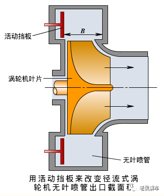 改变涡轮机进口截面积方法。在涡轮机的进口处安装一个可摆动27°角的舌片,可动舌片的转轴固定在涡轮机壳体上,可动舌片的摆动即涡轮机进口截面积的变化由电控单元根据柴油机的转速信号进行控制。