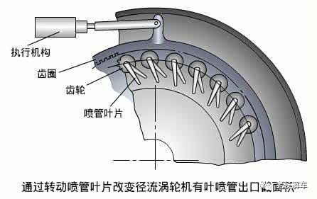 在大排量重型车用涡轮增压发动机上多采用涡轮机喷管出口截面可变的涡轮增压器,简称变截面涡轮增压器。在这种涡轮增压器中,通过改变喷管出口截面积来调节增压压力。当发动机低速运行时,缩小喷管出口截面积,使喷管出口的排气流速增大,涡轮机转速随之升高,增压压力和供气量都相应增加;当发动机高速工作时,增大喷管出口截面积,使喷管出口的排气流速减小,涡轮机的转速相对降低,这样增压器将不会超速,增压压力也不致于过高。在有叶径流式涡轮机中,可以采用转动喷管叶片的方法来改变喷管出口截面积。喷管叶片与齿轮相连,齿轮与齿圈啮合,当执行机构往复移动时,齿圈或向左或向右转动,带动与其啮合的齿轮转动,并使喷管叶片随其转动,从而使喷管出口截面积发生改变。