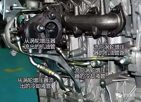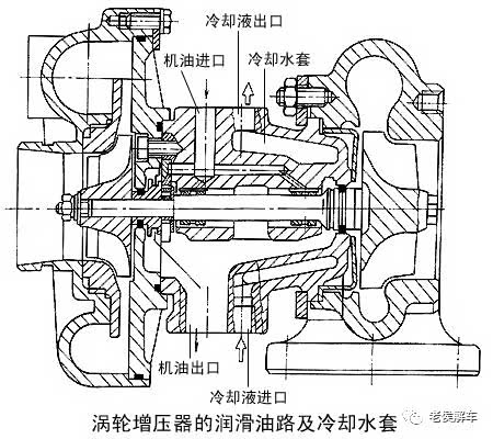 来自发动机润滑系统主油道的机油,经增压器中间体上的机油进口进入增压器,润滑和冷却增压器轴和轴承。然后,机油经中间体上的机油出口返回发动机油底壳,在增压器轴上装有油封,用来防止机油窜入压气机或涡轮机蜗壳内。如果油封损坏,将导致机油消耗量增加和排气冒蓝烟。