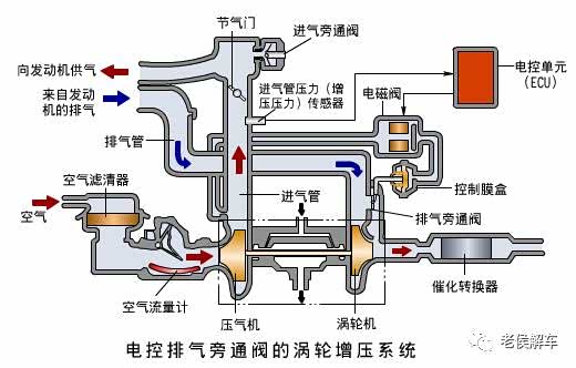 在有些发动机上,排气旁通阀的开闭由电控单元控制的电磁阀操纵。电控单元根据发动机的工况,由预存的增压压力脉谱图确定目标增压压力,并与增压压力传感器检测到的实际增压压力进行比较,然后根据其差值来改变控制电磁阀开闭的脉冲信号占空比,以此改变电磁阀的开启时间,进而改变排气旁通阀的开度,控制排气旁通量,借以精确地调节增压压力虽然排气旁通阀在涡轮增压汽车发动机上得到了广泛的应用,但是排气旁通之后,排气能量的利用率下降,致使在高速大负荷时发动机的燃油经济性变差。