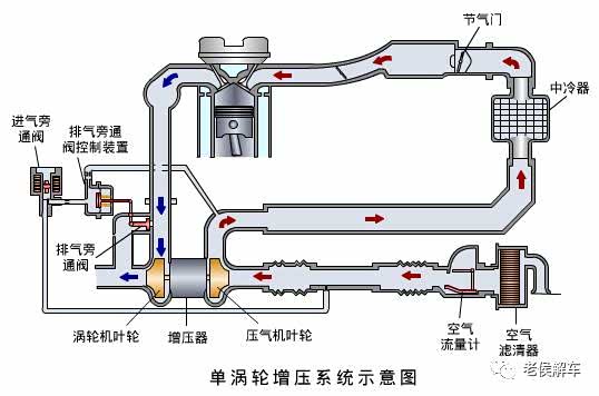 只有一个涡轮增压器的增压系统为单涡轮增压系统。涡轮增压系统除涡轮增压器之外,还包括进气旁通阀、排气旁通阀和排气旁通阀控制装置等。