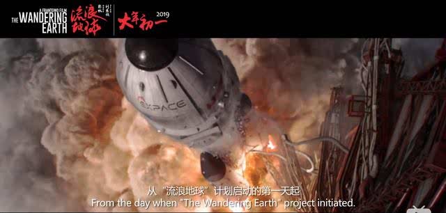 图注:《流浪地球》片中出现了类似“长征”5号的运载火箭(图源:《流浪地球》预告片截图)