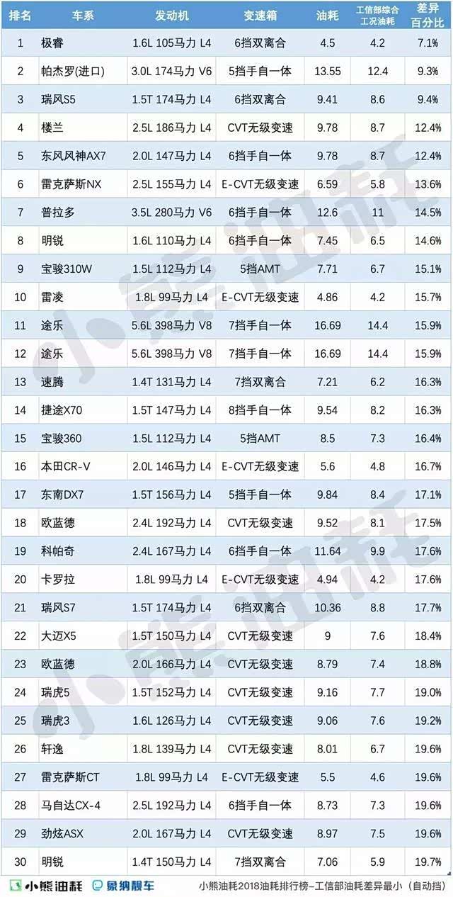 近日,小熊油耗官方公布了2018年油耗排行榜,之前大咖就和大家点评了一下几款实际油耗与工信部油耗差异较大的车型,今天就来和大家说说自动挡中哪几款车型与工信部油耗差异较小,给大家买车做个参考。