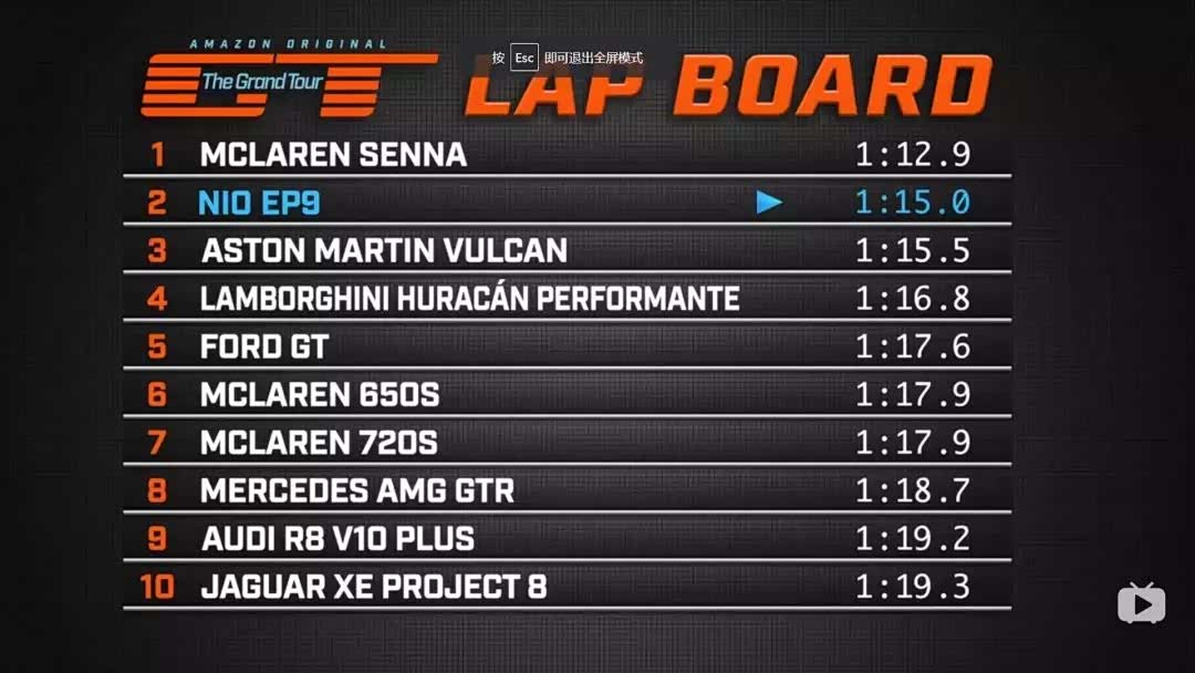 就在上周,全球知名网络节目《The Grond Tour》中,就测试了国产电动跑车蔚来EP9。在自家的埃博拉赛道中夺得了1分15秒的圈速成绩,赛道榜上排名第二,仅次于迈凯伦塞纳,优于阿斯顿Vulcan,兰博基尼huracan performante等知名跑车。