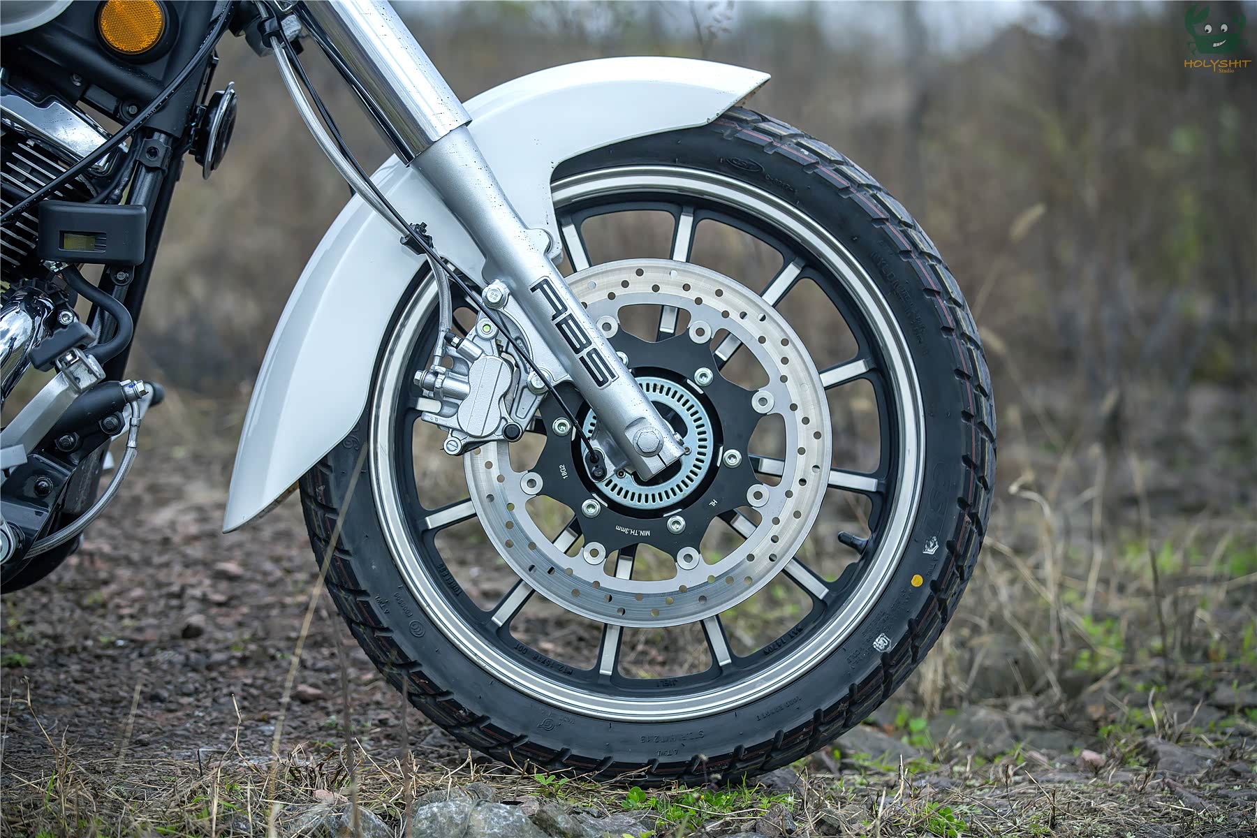 19款V16前轮尺寸90/90-18,后轮130/90-15,采用正新全路况轮胎。前刹车采用单刹车盘配单向双活塞卡钳,后刹车采用单活塞卡钳,同时搭载博世ABS刹车防抱死系统。虽然说速度感并不是美式巡航车的追求,但能在很大程度上增强了骑行者的信心。