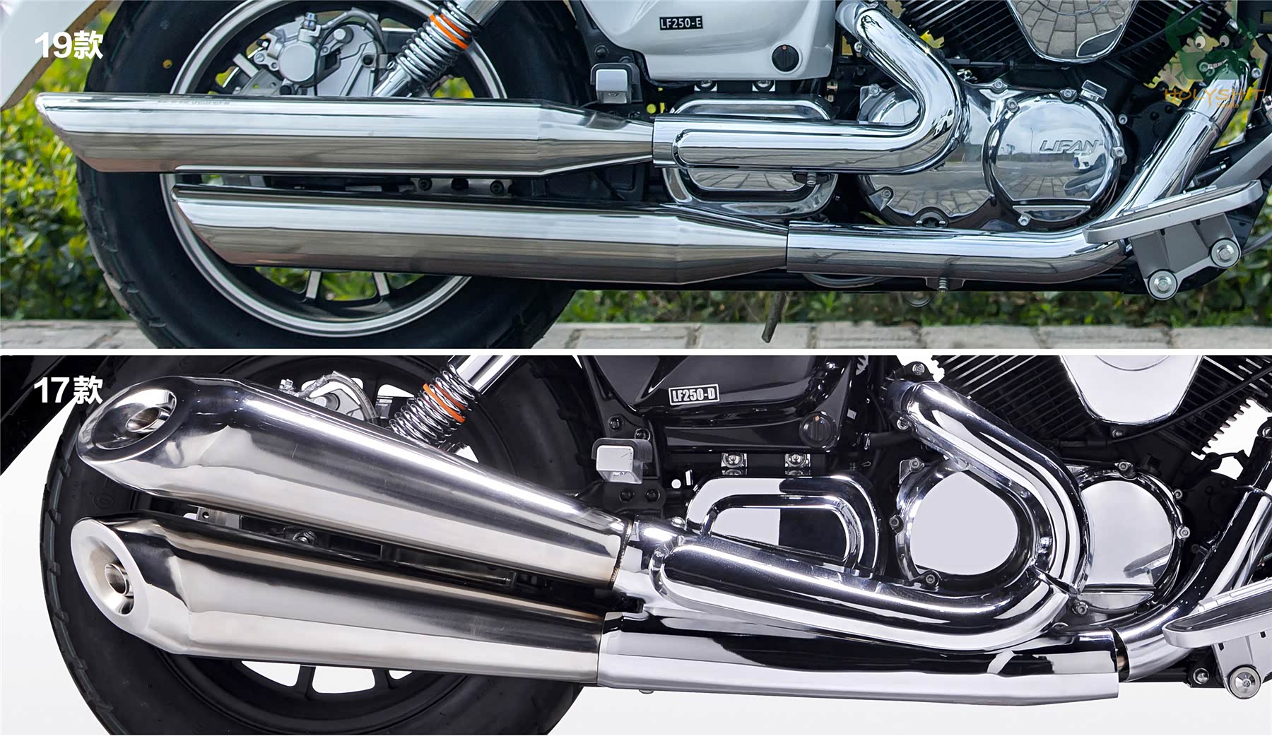 排气管:19款车型将17款奇怪的排气管去掉,替换成两根修长且相互平行的排气管,简约工整又有气势,这让新款V16的外形大大改观,向纯正的美式巡航车进一步靠近。配合V型双缸发动机让整个动力输出系统浑然一体。