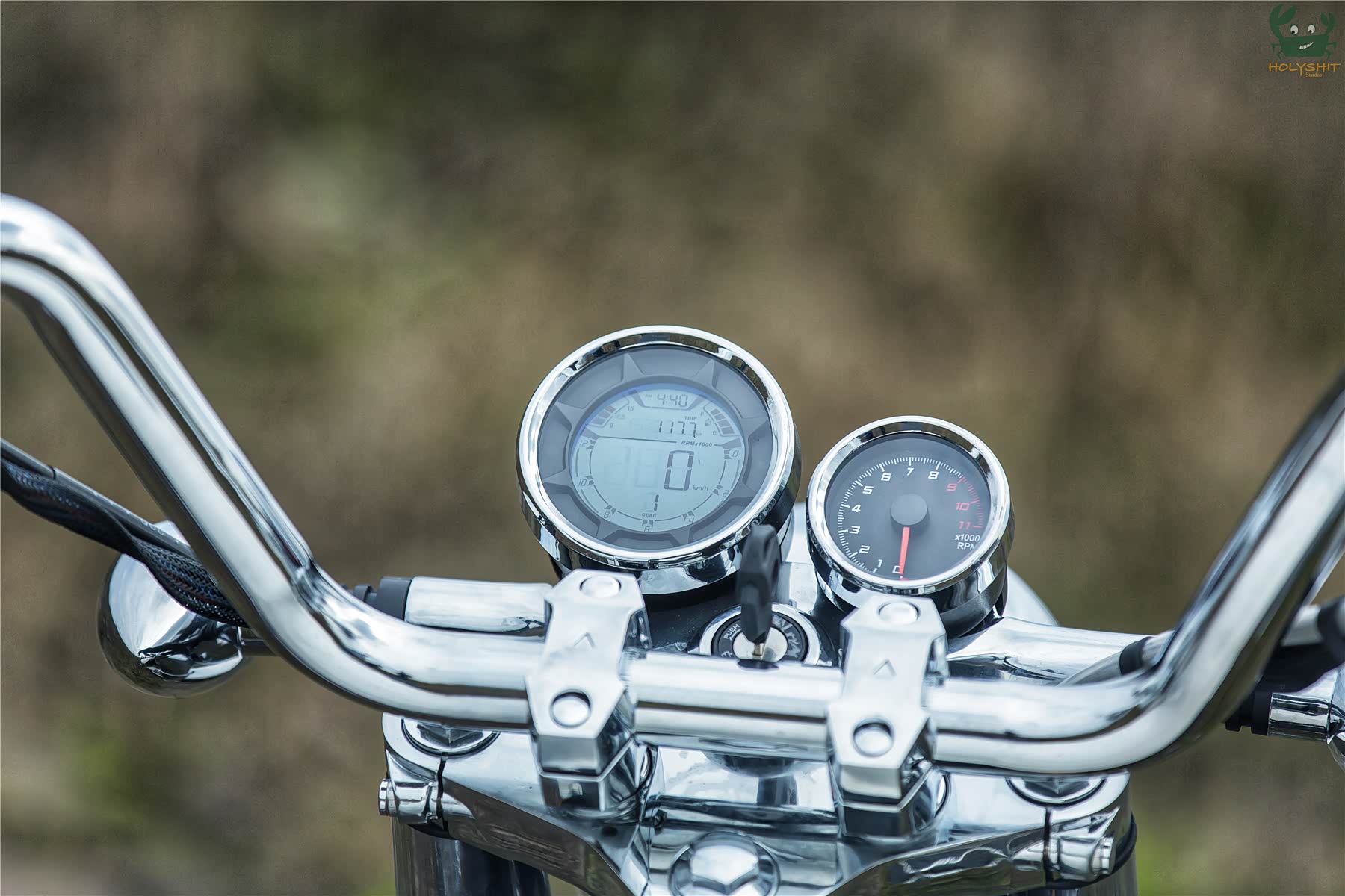 相比于单缸发动机,V缸带来的震动感更小,发动机也没有多余杂音。直到发动机转速逼近6000rpm时,才能感受到明显的抖动,不过正常的骑行,5000rpm以内就足够了。前减震的调校偏向舒适,能过滤掉铺装路面的小坑洼;后减震调校稍硬,能给到足够的支撑和整体感。座垫则不够柔软,长时间骑行舒适度有所下降。