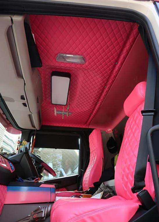 车头颜色被改为粉红色,这仅仅是一个开始,这辆车的内饰配色也主要以粉红为主,这真是浓浓的少女风呀。可以看到,在驾驶室内部,无论是座椅、车顶还是说中控部分,都采用了粉红软性皮革包裹,这为驾驶室营造出了一种堪称梦幻的氛围。