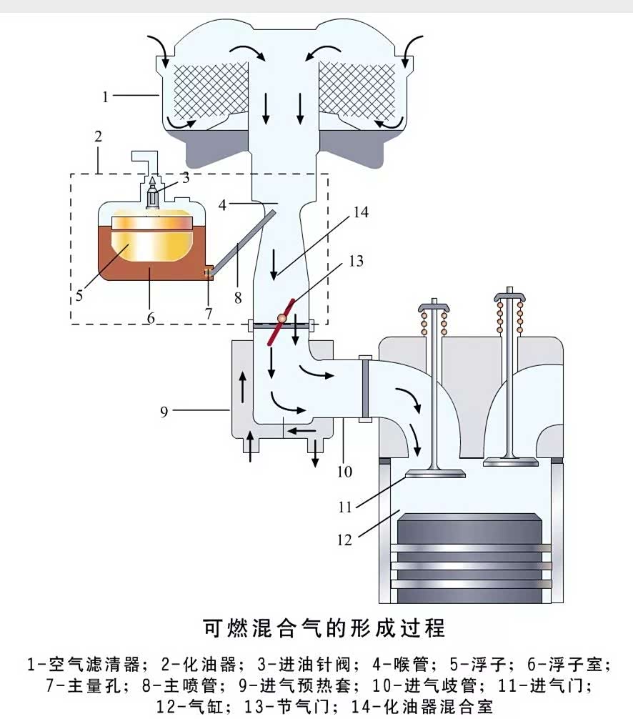 汽油和空气根据发动机不同工况下的使用需求,以一定的比例在进气道或气缸中混合,配制出一定数量和浓度的可燃混合气,定时、定量的供入气缸,然后在气缸中燃烧、爆炸,产生高温高压的气体,推动活塞运动做功,最后把燃烧后产生的废气排出发动机外。这就是汽油机的工作原理。那么二者是如何形成可燃混合气的、又是如何调配可燃混合气的浓度和数量的呢?