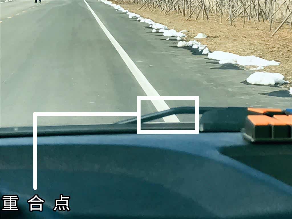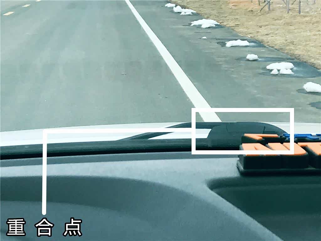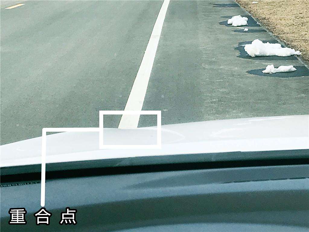 判断右轮位置的方法和左车轮的方法一样,还是找重合点,那就是雨刮器最高点和白线重合的位置,这是防止右轮压线的参照点。