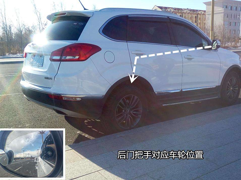 判断两侧后车轮的位置可以通过门把手作为参照物来实现,当靠边停车时观察倒车镜,能看到后车门的门把手,它的下方基本上就是两侧车轮的位置。