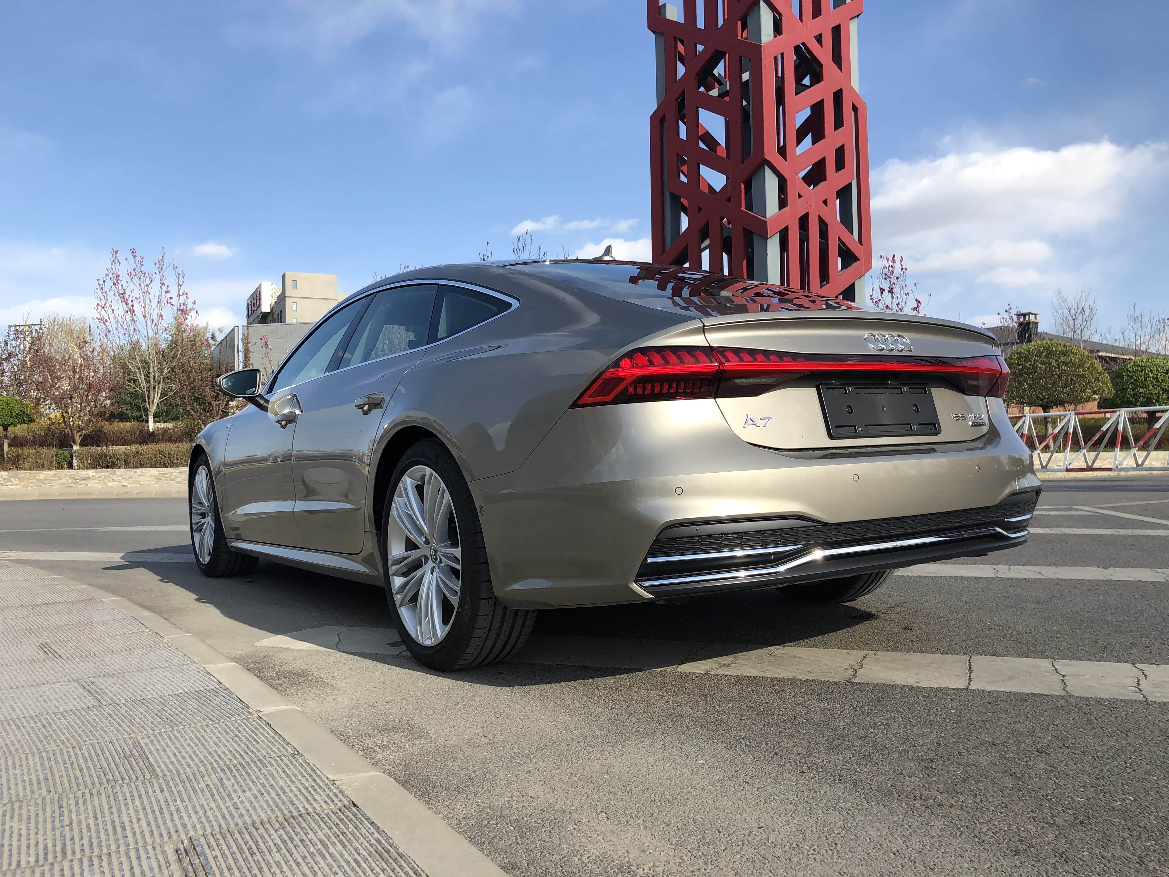 这次拿到的测试车是新上市的奥迪A7 55 TFSI竞技版,算是A7的高配车型了。车身颜色是白金色(我们一般叫香槟色)车身,黑色内饰。本来呢,我是对香槟色这种颜色,最无感的了,感觉他不如黑色酷帅,不如白色精致,也不如其他鲜艳颜色那么有活力。但开了两天下来,我发现我开着这台香槟色的A7的时候,会更想去穿卡其色的裤子,也更想穿皮鞋了。然后也想把衬衫的袖子挽起来,有时候还想打开天窗感受一下迎面而来的风。我不太确定开在大街上,大家有没有对我和我的车行注目礼,但是我的自我感觉特别良好。颜色真是个很神奇的东西。