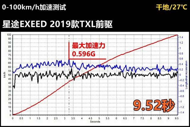 从0-100km/h加速曲线图上看,星途TXL全油门起步瞬间,有明显的DSG保护特征,不过保护介入的过程有些长,差不多有0.5秒左右的时间,不过9.52秒的最快成绩倒是颇有些出乎我们的意料。由于起步1秒之后我们基本上已经"看破"了星途TXL变速箱的标定水准,料定这款车的加速成绩会突破10秒大关。所以对于这个很不错的加速成绩而言,星途TXL那套1.6T引擎怕是要拿走75%左右的功劳。
