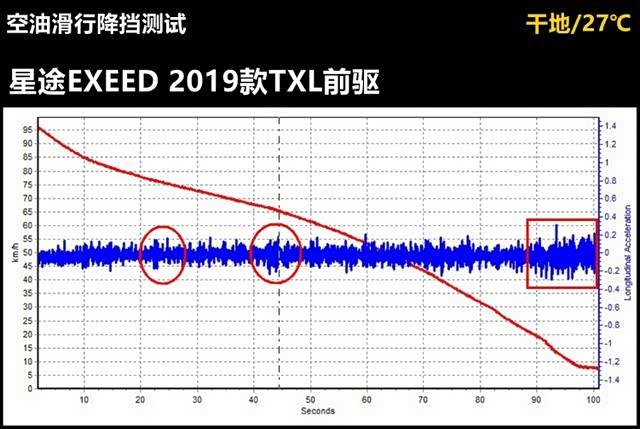 最后再来看一下星途TXL从7挡空油滑行到1挡的动态测试。空油滑行其实是对双离合变速箱标定水准最直观的测试手段之一。测试的起始车速是100km/h。从图中不难看出,整个滑行的曲线不够线性,其中在高挡位区可以看出两次明显降挡的特征(红圈部分),在低挡位区,蓝色加速力曲线的波动幅值有明显增强(红框部分),有明显顿挫产生。所以,这套双离合变速箱的标定还需要好好打磨打磨。