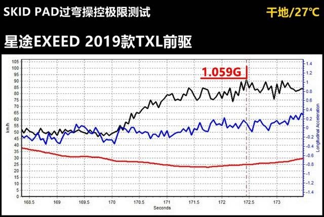 在操控测试方面,1.059G的最大转向加速度已经大大超出我们对星途TXL的预期。对于这个级别的SUV而言,过弯极限能接近1G就已经是很NB了。其实从星途TXL的轴距、重心高度以及车重来看,其操控表现是不值得期待的。所以我们认为对于这样的结果,轮胎应该占一半功劳——此外再强调一下,悬架的软硬不是决定一款车操控的必要条件。