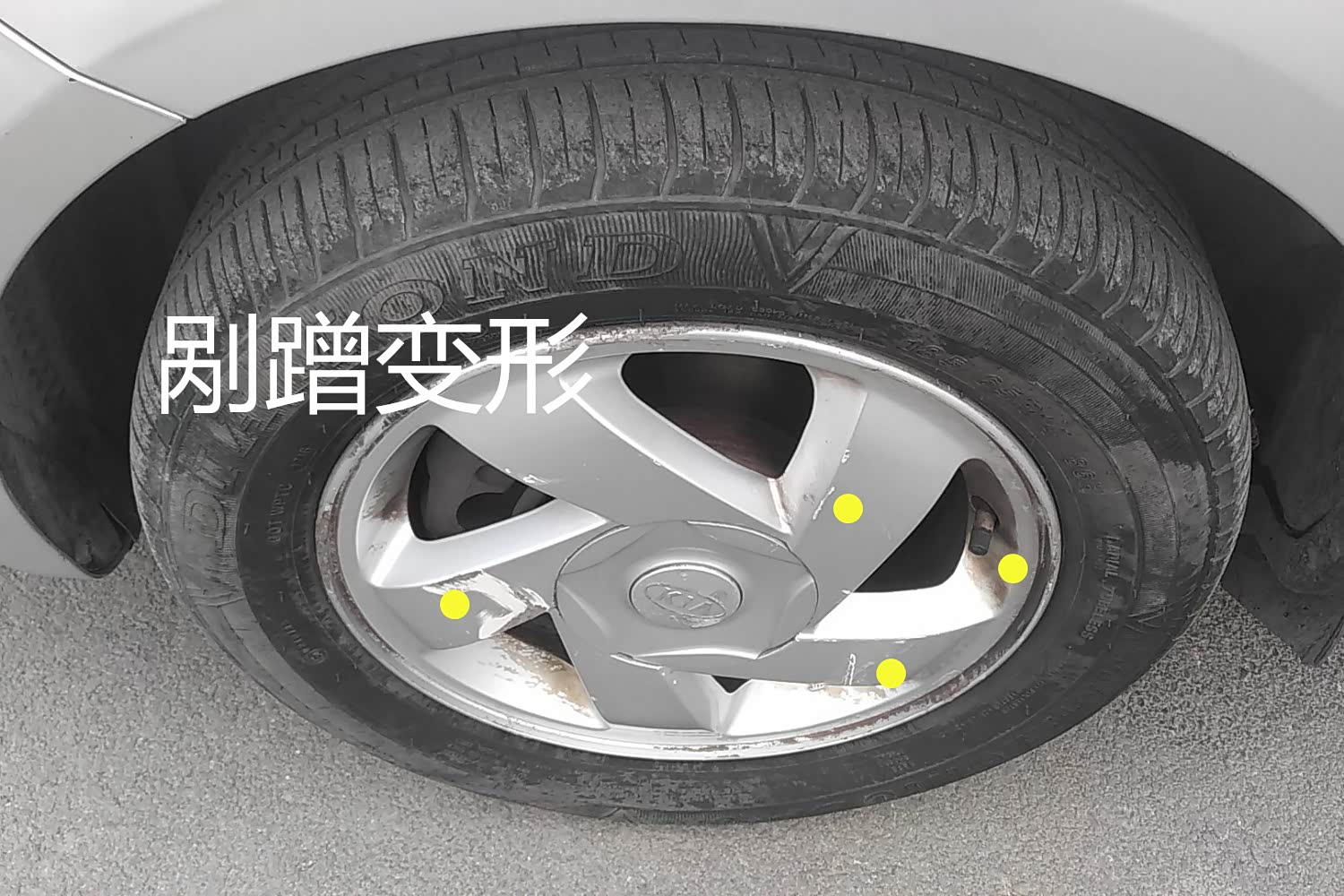 轮毂也是不可避免的伤痕累累,不过好在主体没有变形,不然车辆高速行驶时候一定会发飘。