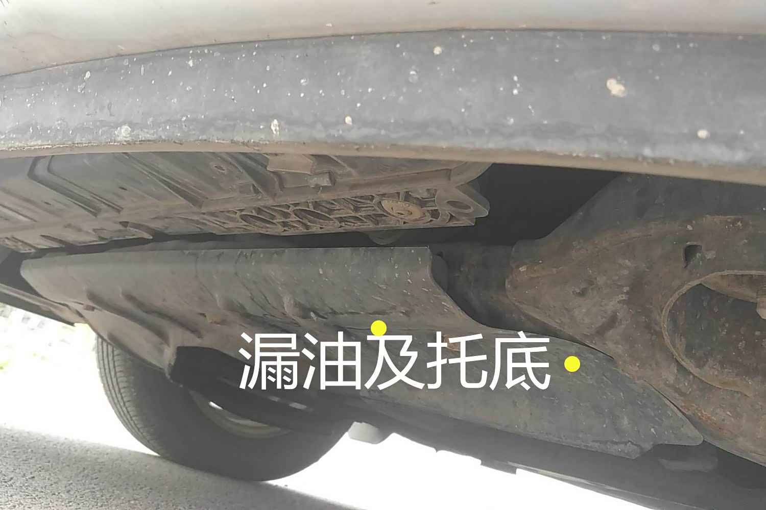 这里的底盘防撞护板上有油迹并且有少量的托底变形,不过还好没有很严重的伤,不然伤到了油底壳就麻烦了,油底壳是储存机油的一个容器在最下面,平时车辆着车后通过油泵吸入进需要润滑的地方,灭车后机油自己会回到储存处。