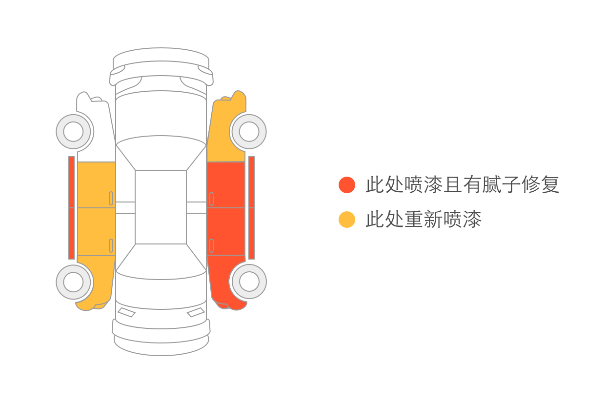 此图为该车的喷漆结构图,可以看到除了大顶机盖和左前翼子板其余全喷漆了,并且右侧的腻子修复痕迹明显,主要是因为咱们是左侧驾驶,右侧是视觉盲区通过后视镜还是不能完全判断,所以剐蹭伤较多。