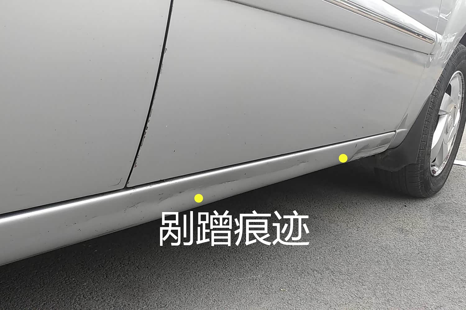 左前45°发现前杠位置有剐蹭痕迹已经掉漆,并且车门下部的防撞装饰条也有翘起和划痕。