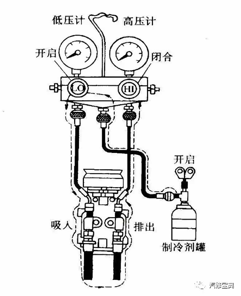 d.从高压侧注入规定量的液态制冷剂。最后关闭制冷剂罐注入阀及空调压力表上的手动高低阀,并卸下空调压力表。