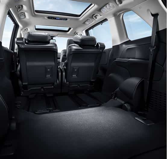 想要第二排座椅有足够的施展空间,就要将第三排座椅隐藏。需先放平第三排座椅,旋转180°扣在车尾部,这样就可以给第二排座椅足够的展示空间。