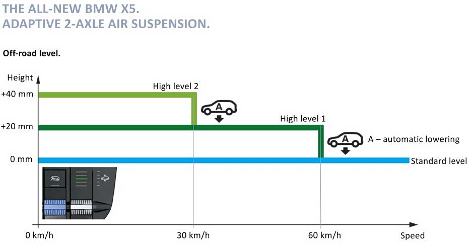 只有配备了空气悬挂的X5才能够选装越野套装(xOffroadPackage),这套空气悬挂的具体细节可参考上一期文章《全新 宝马X5赛道试驾,这是一款革命性的产品!》。部分内容如下: