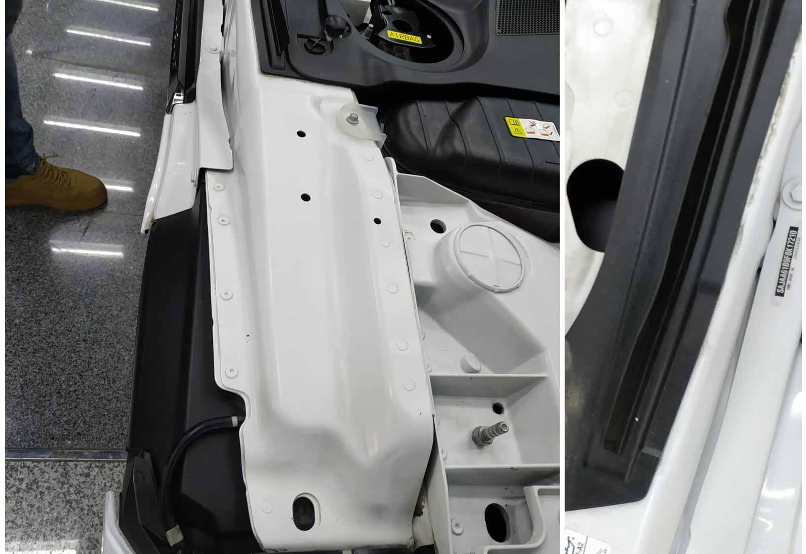 后备箱是掀背的,经检查没有拧动痕迹,后围板也是原厂状态,没有任何变形和其他异常情况,发现行李箱盖拉手损坏,后期需要重新安装一个。