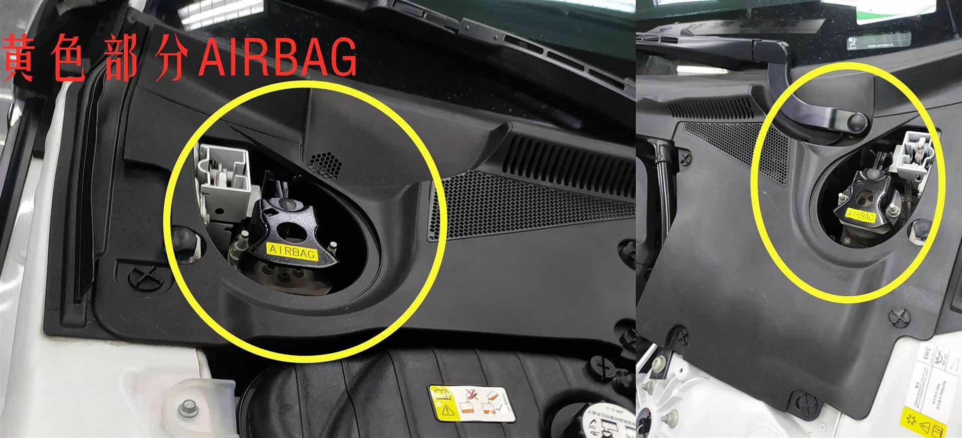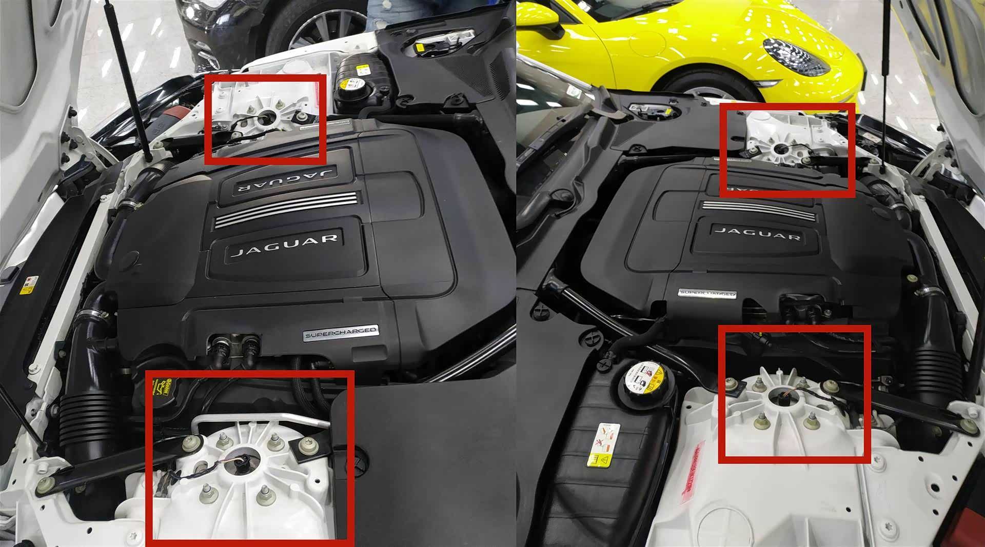 捷豹F—type发动机舱盖采用的是反向打开方式,铰链位于车辆最前部,这种设计一般用于跑车,其主要目的是为了安全,可以看到图中在引擎盖和下方连接处有一个“airbag”,也就是安全气囊的意思,可以在前方发生严重追尾情况下,弹开发动机舱盖,防止车内人员受伤。