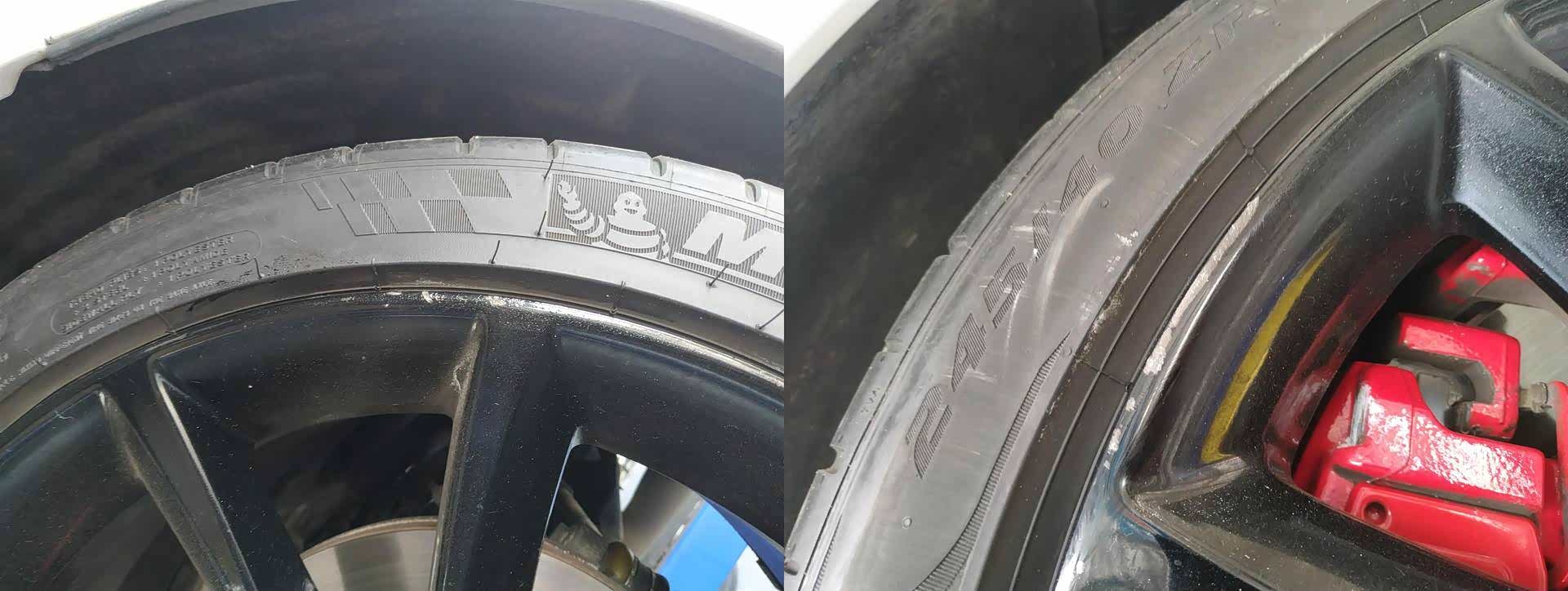 轮毂很漂亮,右前以及左后轮毂缺肉划伤,并不严重,建议翻新一下,跑车的轮胎扁平比低,路面不好减少慢行,避免高速过坎等注意事项。