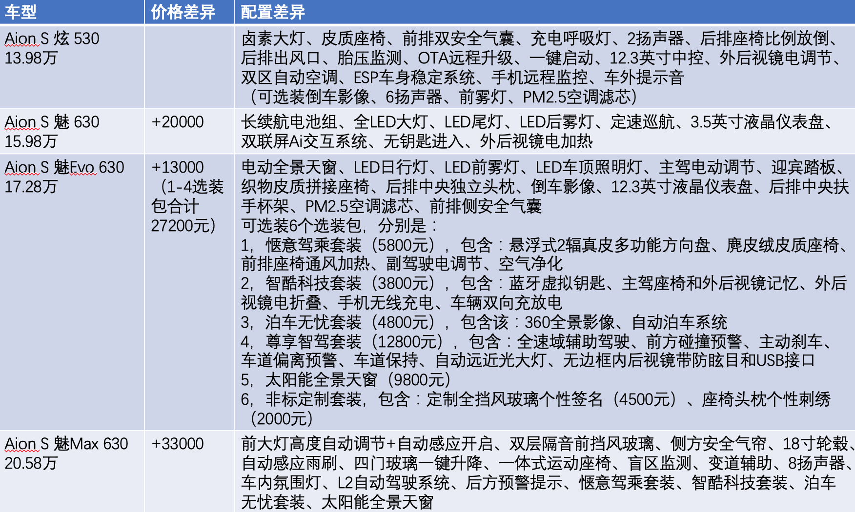 这里额外分析一下Aion S复杂的选装包系统。比较主要的有四个选装包:惬意驾乘、智酷科技、泊车无忧、尊享智驾。这四个选装包合起来的价格是27200元,如果要在魅Evo 630的基础上选装这四个选装包的话,不如直接考虑最高配的魅Max 630,因为在配置表中我们可以看到魅Max 630带有L2级自动驾驶系统,这个系统包含了尊享智驾套装的配置,再加上魅Max 630的配置中本来就包括了另外三个选装包的配置,所以魅Max 630相比魅Evo 630贵的那33000中,已经包含了27200元的四个选装包。剩下贵出的5800元,包含了表格中最后一栏的这些配置,还是比较值的。