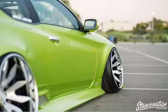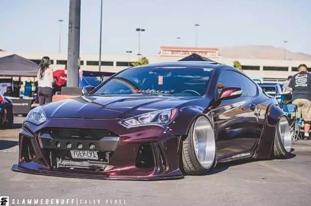 宽体的浪潮持续高热,除了RocketBunny、LibertyWalk这类大厂出品的宽体套件之外,也有着很多出色的DIY宽体作品,他们制作出来的效果丝毫不比大厂的差。这台劳恩斯酷派,深沉的紫色在它身上散发着独特的气息。出自Ark Performance的前包围非常具有侵略性,让劳恩斯酷派的前脸马上变得凶恶起来,大型的散热孔后面还预留着很多的升级空间。尾标去掉的尾部看起来很简洁,后装的LED尾灯比原厂的个性了很多。326Power出品的尾翼极具个性,不过装在了这辆宽体劳恩斯身上却毫无违和感,后包围的下扰流让这身宽体看起来没那么单调。这身DIY的宽体虽然有很明显抄袭RocketBunny的嫌疑,不过看起来贴合度还是很不错,不会觉得破坏了原车的线条,整体效果非常棒。搭配这套Infinitewerks的MR三片式轮毂,抛边宽到了近乎极限,加上全身拉丝银色,绝对是谋杀快门的利器。