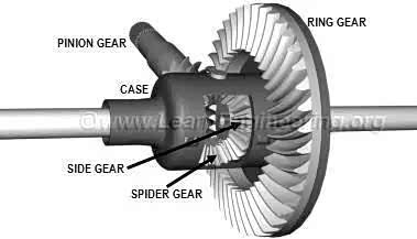 开放式差速器的基础元件如下图所示,它由行星齿轮、齿圈、差速箱、差速轮和半轴齿轮构成。