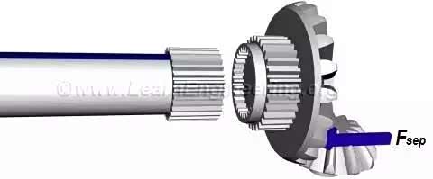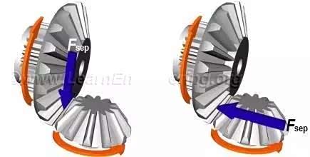 你会注意到差速轮和半轴齿轮都是锥型齿的。而锥型齿有一个特点:当扭矩通过锥型齿进行传递,除了产生切向力,还会产生轴向力。后者会试图把两组齿轮分开。