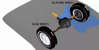脑补一下这个场景:当一辆配备开放式差速器的车辆直行时,一侧驱动轮行驶在牵引力良好的路面上,另一侧则在湿滑路面上。在开放式差速器中,左右车轴的旋转是完全独立的。当一侧车轮行驶到湿滑路面上,开放式差速器会使其极速旋转,而牵引力良好一侧的车轮则几乎静止不动。这样一来,绝大部分动力都给了打滑的车轮,有抓地力的车轮却几乎得不到动力,于是汽车就无法前进。