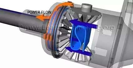 ▲注解:行星齿轮和齿圈用于将引擎的动力传递到差速箱中;差速箱内的差速轮的作用,是允许左右车轴之间有转速差;左右各有一个半轴齿轮,用于驱动车轴。