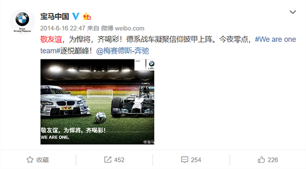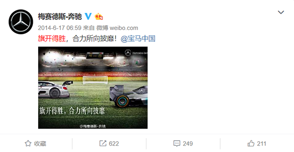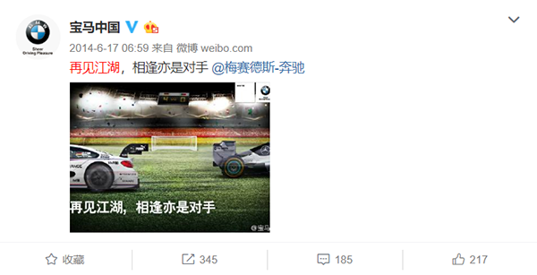 事实上,奔驰宝马这对CP之间的相爱相杀已持续多年了。2014年巴西世界杯德国获得冠军大家一定还记得,当时同为德国品牌的宝马奥迪自然少不了借势。