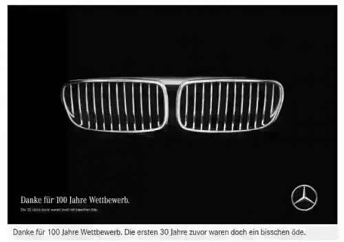 2016年宝马100周年时,两位的隔空喊话令人记忆深刻,奔驰在感谢宝马与自己愉快竞争的同时,悄悄diss了一下宝马。奔驰先是发了一张祝福宝马成立100周年的海报,左下一行大字写到:“感谢100年来的竞争”;下面的一行小字才是重点,写到:“没有你的那30年其实感觉很无聊”,言外之意是奔驰比宝马早成立了30年。之后,有宝马车迷作了一张回应海报,写到:“君生我未生,我生君已老”。