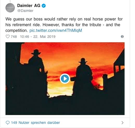 奔驰对于这份大礼,自然不能默默接受,很快做出了回应。在推特中,奔驰配了一张GIF动图,图中有穿着牛仔服的蔡澈背影,正悠闲的骑着马。配文则是,我们猜老板退休后真正想干的事,还是享受纯正马力带来的乐趣。而所谓纯真马力自然指的是“骑马”。