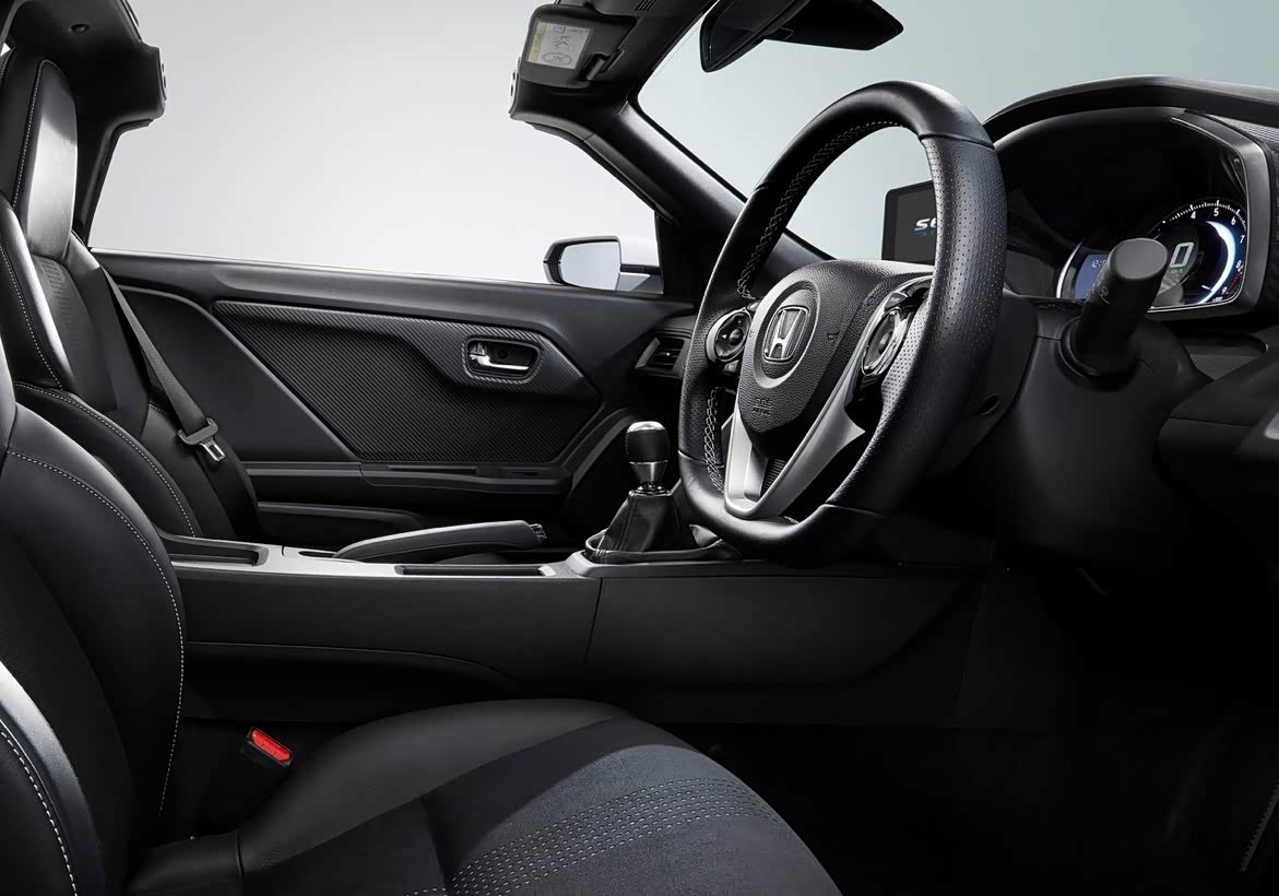 本田S660全黑的内饰设计风格简约而又不简单,仿碳纤维装饰的使用又增强了运动气息。三辐式多功能方向盘的造型是本田家族式设计,但为了突出S660的运动元素,多功能按键周围加入了仿碳纤维材质的装饰,方向盘底部还进行了削平处理。此外,中控的面板很简洁,空调系统和多媒体系统的操作按键布局合理,坐进车内就知道该怎么用,方便快捷上手。中控台上方的悬浮式6.1英寸多媒体屏幕让小编觉得有些惊讶,能在这么狭小的空间里大做文章,本田的设计师也确实很厉害。