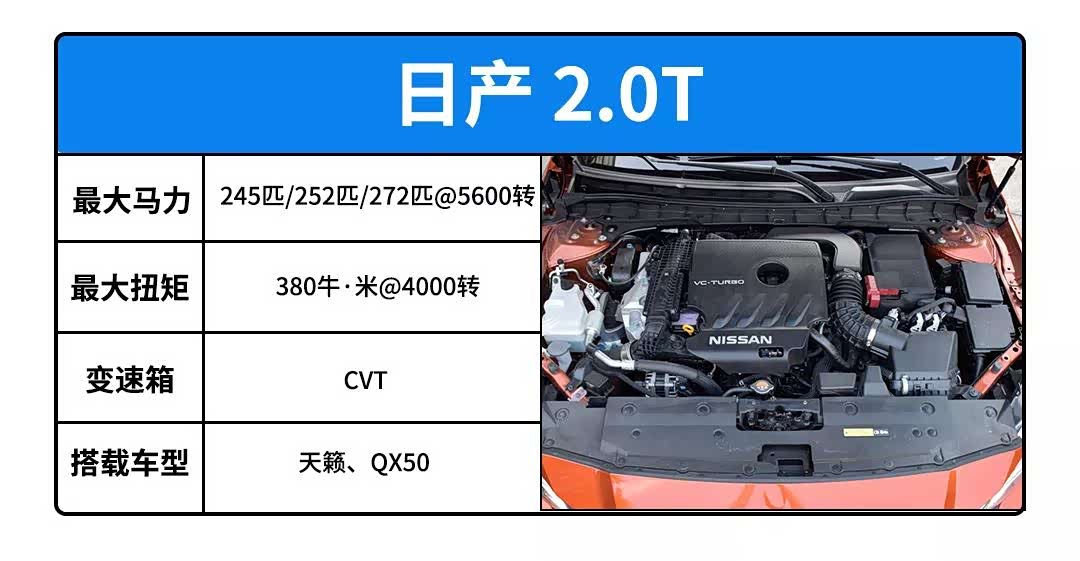 拥有VC-TURBO可变压缩比技术、高压缩比省油、低压缩比运动。变速箱是CVT,加速给人的推背感不强,但是可以维持很长时间。加速快而且平顺,给人一种高级车的从容感。不过这款发动机目前产能不多,较难买到是唯一的缺点。